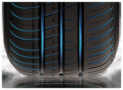 A három függőleges bordázat és az oldalfalakon található kis vízszintes barázdák hatékonyan növelik a tapadást nedves útfelületen, és nagy sebességnél csökkentik a vízen futás lehetőségét.